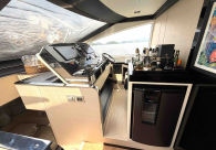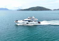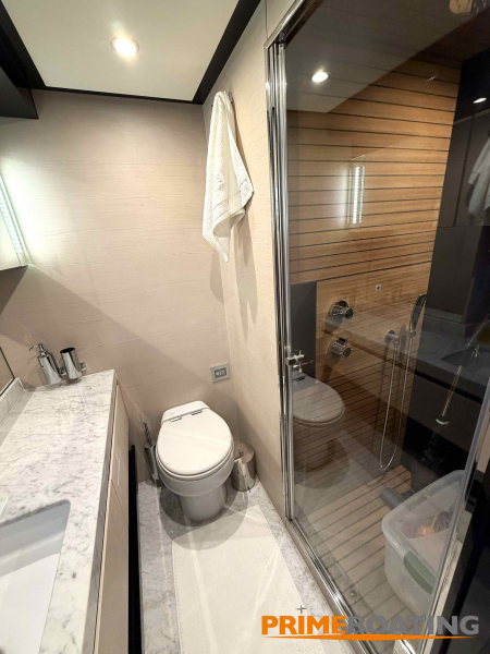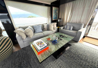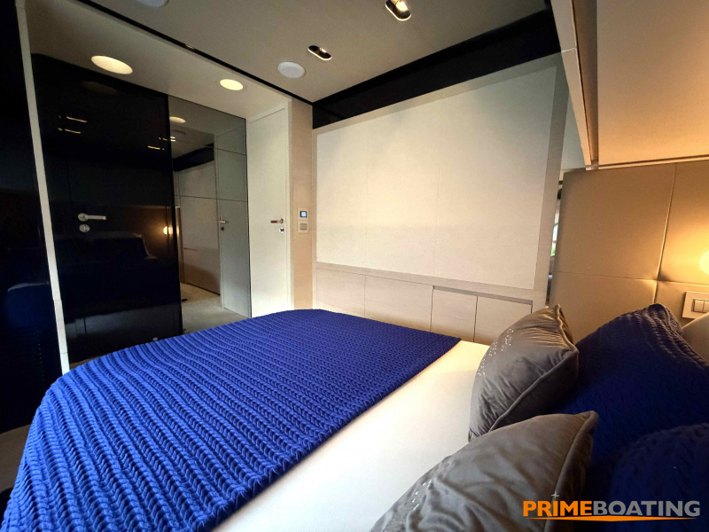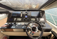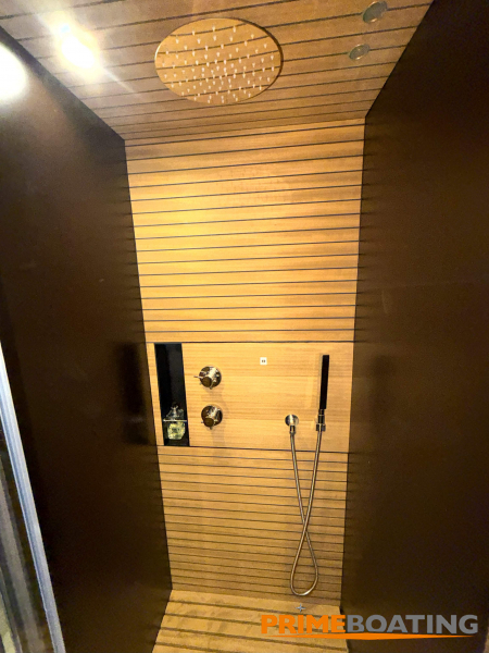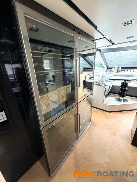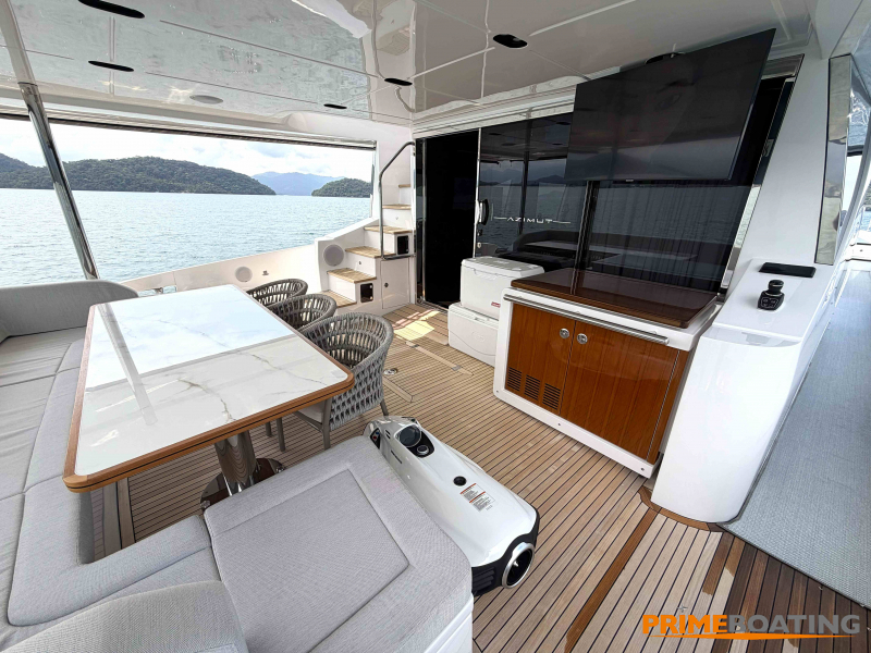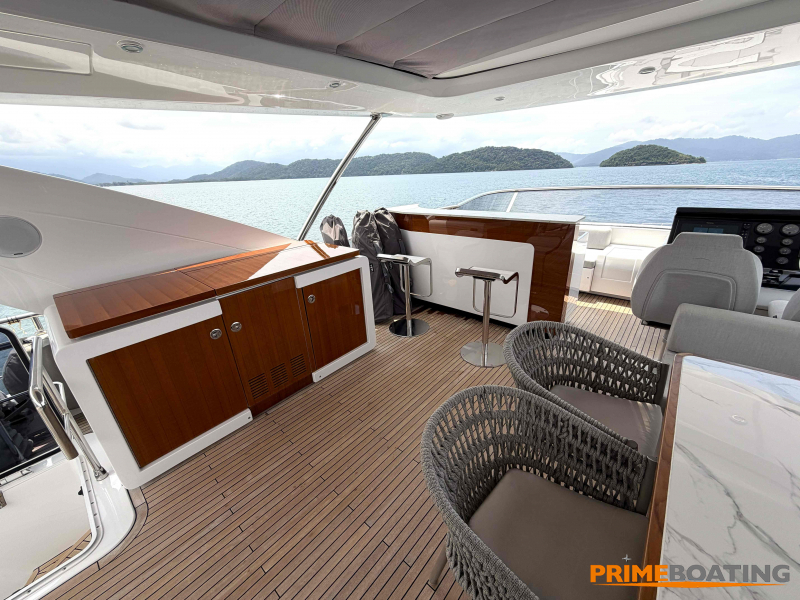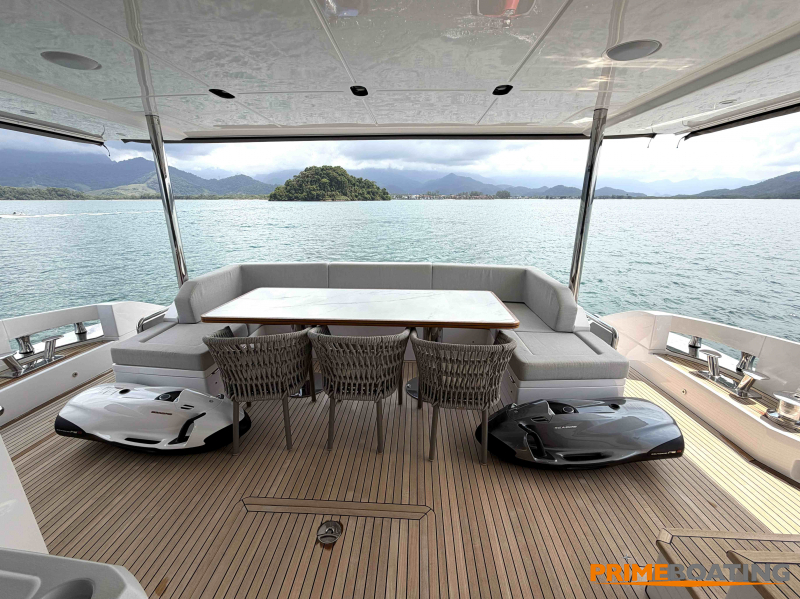 - Opcionais | Hard Top | Contador de corrente com mostrador no Comando Principal e Flybridge | Revestimento em teca no piso dos passadiços laterais e proa | Cozinha fechada | Extensão do móvel do bar no flybridge com duas banquetas | Flaps estabilizadores Zerospeed | Hélice de manobra de popa (Stern thruster) | Plataforma de popa alongada | Geladeira tipo gaveta na cabine marinheiro | Passarela telescópica hidráulica com controles remotos | Micro-ondas na cabine marinheiro | Revestimento em teca no piso do flybridge | Piso em madeira no salão, dinete e comando central | Terceira cama na cabine marinheiro | Kit de dimerização dos ambientes internos | Icemaker no móvel do flybridge | Icemaker no móvel da praça de popa | Pacote de eletrônicos Raymarine Gold | Sistema de lavação extra da âncora | Kit joystick de manobra Rexroth-MAN | Adega salão | Sistema de áudio e vídeo (marca Fusion) | Kit banheiro simétrico cabine Armador (vaso sanitário e bidê) | Cadeiras de popa dobráveis (modelo Oskar — 04 unidades) | Flaps Humphree | Cofre eletrônico cabine Armador | Luzes submersíveis (04 unidades — espelho de popa) | Farol de busca elétrico com comando adicional no flybridge | Churrasqueira elétrica móvel no bar do flybridge | Churrasqueira elétrica móvel na praça de popa | Opcionais incluídos | Pintura do costado + borda do convés | Pintura externa do hardtop + pintura dos dois domos e antena | Fundo com pintura anti-incrustante | Toldo retrátil elétrico no flybridge | Toldo retrátil elétrico na praça de popa | Kit opcional: joystick de manobra + 3ª estação Rexroth-MAN | Tendalino removível manual de proa | Mesa lounge de proa em Calacatta | Mesa da praça de popa em Calacatta | Mesa do flybridge em Calacatta | Antena TV satélite STV45 Brasil | Domo vazio para antena TV satélite STV45 Brasil | Banheira de hidromassagem no flybridge | Cabine de convidados BE transformada em lounge e TV | Bar extra no flybridge sem instalações de hidráulica a BB | Reservatórios para alimentação dos icemakers com água mineral | 2 x Seakeeper NG 9000 |