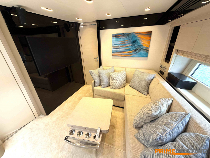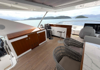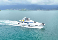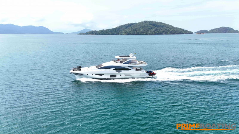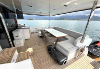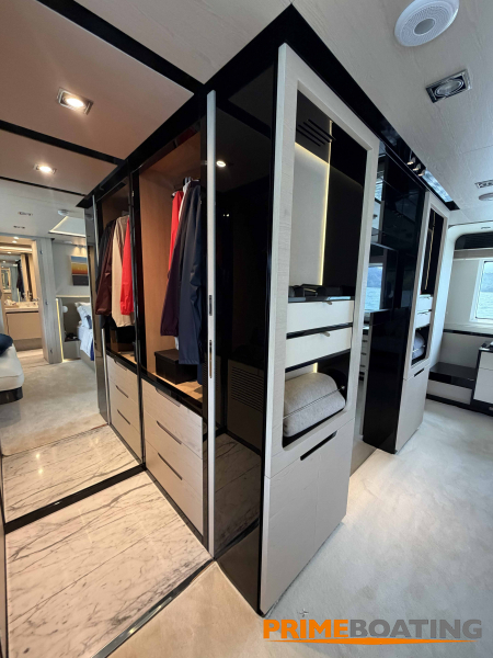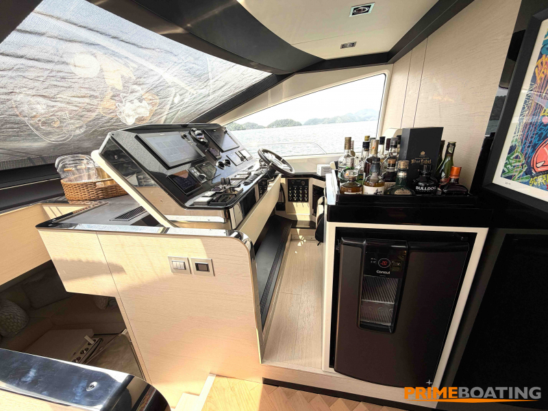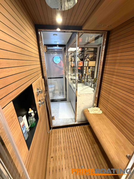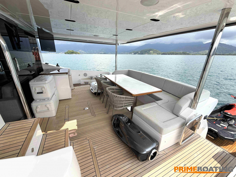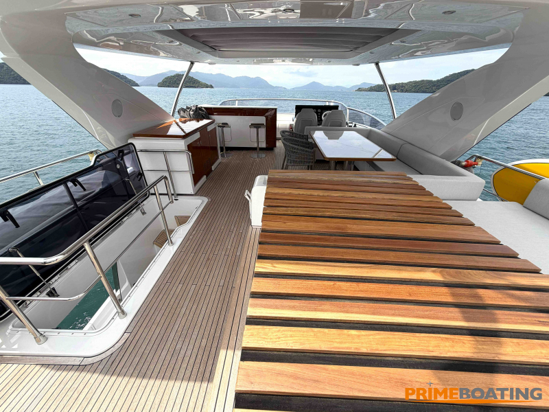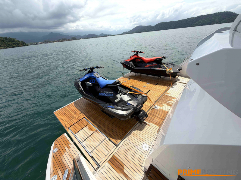 - Opcionais | Hard Top | Contador de corrente com mostrador no Comando Principal e Flybridge | Revestimento em teca no piso dos passadiços laterais e proa | Cozinha fechada | Extensão do móvel do bar no flybridge com duas banquetas | Flaps estabilizadores Zerospeed | Hélice de manobra de popa (Stern thruster) | Plataforma de popa alongada | Geladeira tipo gaveta na cabine marinheiro | Passarela telescópica hidráulica com controles remotos | Micro-ondas na cabine marinheiro | Revestimento em teca no piso do flybridge | Piso em madeira no salão, dinete e comando central | Terceira cama na cabine marinheiro | Kit de dimerização dos ambientes internos | Icemaker no móvel do flybridge | Icemaker no móvel da praça de popa | Pacote de eletrônicos Raymarine Gold | Sistema de lavação extra da âncora | Kit joystick de manobra Rexroth-MAN | Adega salão | Sistema de áudio e vídeo (marca Fusion) | Kit banheiro simétrico cabine Armador (vaso sanitário e bidê) | Cadeiras de popa dobráveis (modelo Oskar — 04 unidades) | Flaps Humphree | Cofre eletrônico cabine Armador | Luzes submersíveis (04 unidades — espelho de popa) | Farol de busca elétrico com comando adicional no flybridge | Churrasqueira elétrica móvel no bar do flybridge | Churrasqueira elétrica móvel na praça de popa | Opcionais incluídos | Pintura do costado + borda do convés | Pintura externa do hardtop + pintura dos dois domos e antena | Fundo com pintura anti-incrustante | Toldo retrátil elétrico no flybridge | Toldo retrátil elétrico na praça de popa | Kit opcional: joystick de manobra + 3ª estação Rexroth-MAN | Tendalino removível manual de proa | Mesa lounge de proa em Calacatta | Mesa da praça de popa em Calacatta | Mesa do flybridge em Calacatta | Antena TV satélite STV45 Brasil | Domo vazio para antena TV satélite STV45 Brasil | Banheira de hidromassagem no flybridge | Cabine de convidados BE transformada em lounge e TV | Bar extra no flybridge sem instalações de hidráulica a BB | Reservatórios para alimentação dos icemakers com água mineral | 2 x Seakeeper NG 9000 |